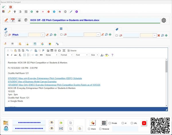 - Embedded hyperlinks to external resources (EEPC Schedule, Business Model Canvas Examples, Scoring Rubric) that remain active and clickable